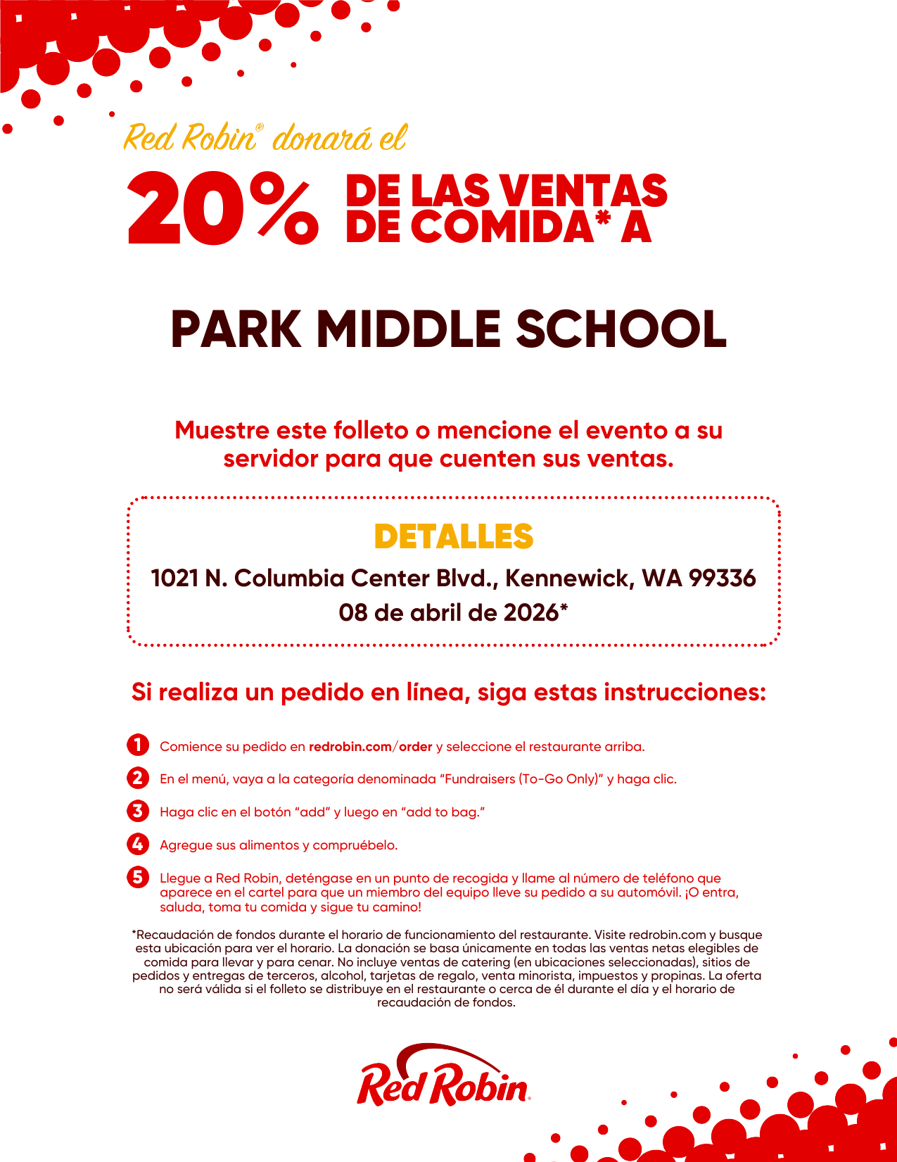 Who doesn't love Red Robin! Please mark your calendars and join us on Wednesday, April 8th. A portion of your order is donated back to Park's ASB. (Make sure you show the server this flyer.)